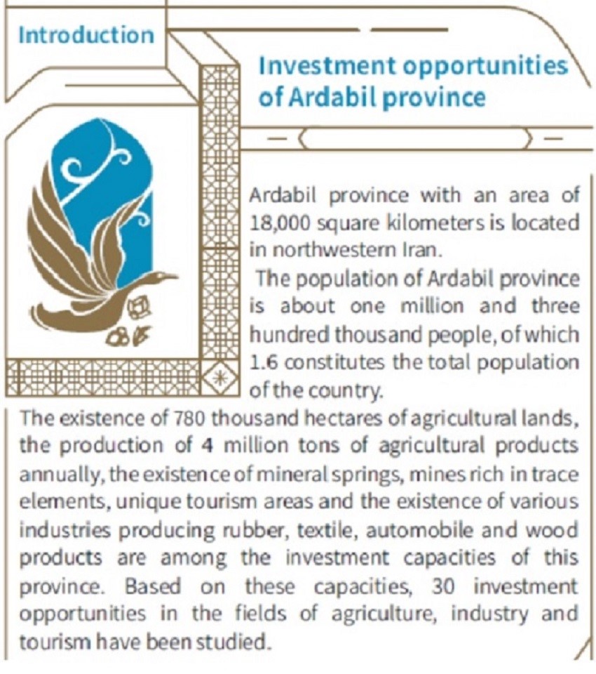 İran İslam Respublikasının Ərdəbil vilayətinin investisiya imkanlarını öyrənmək və daha ətraflı məlumat əldə etmək istəyənlər www.investinardabil.ir saytına müraciət edə bilərlər.