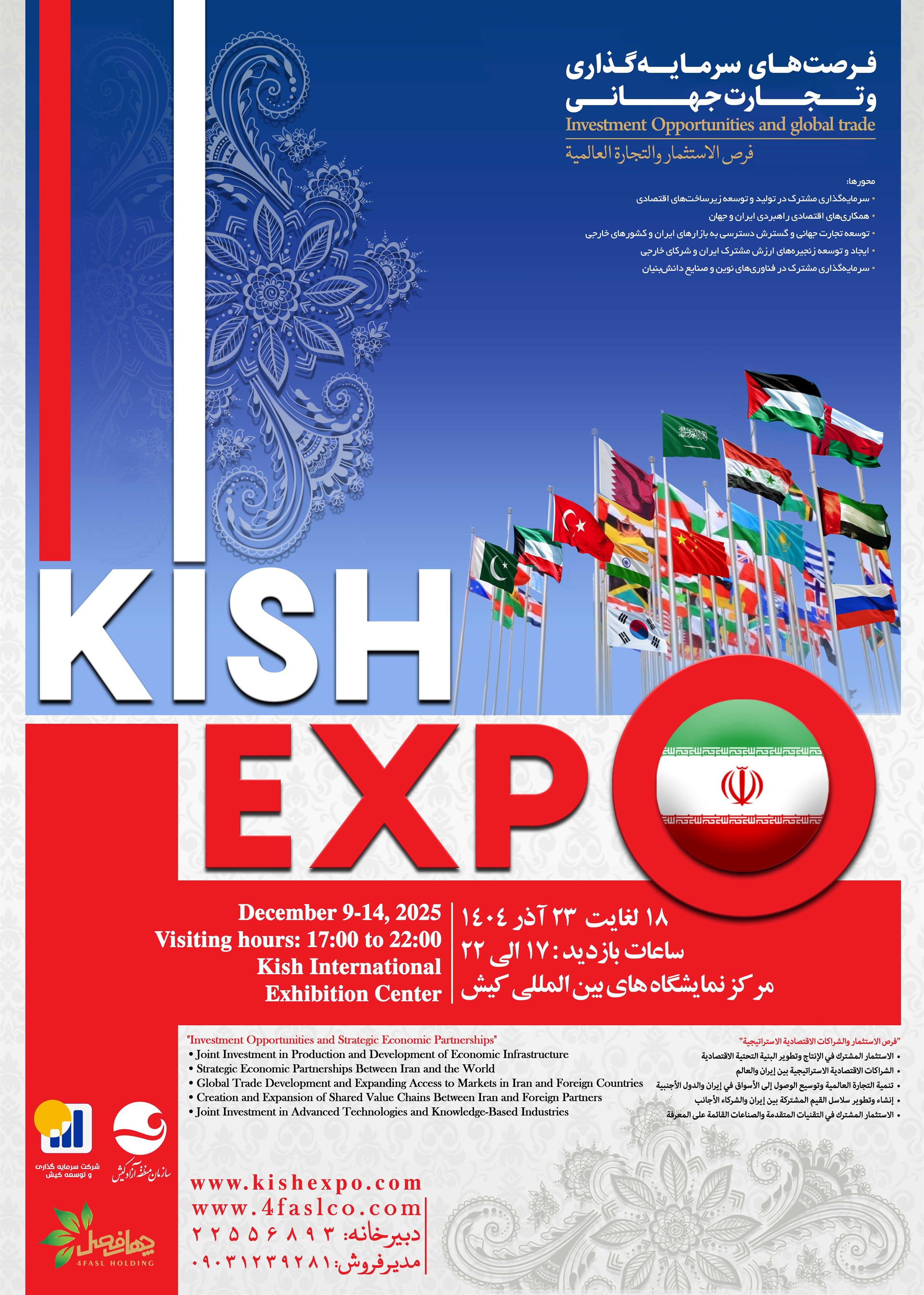 نمایشگاه بین المللی کیش اکسپو با هدف نمایش ظرفیت ها و توانمندی‌های اقتصادی و صنعتی و فرصت های سرمایه گذاری در زیرساخت های کلیدی ایران و سایر کشورهای مشارکت کننده، ایجاد و توسعه روابط تجاری بین المللی و جذب سرمایه گذاری خارجی و ترویج نوآوری و فناوری‌های پیشرفته از تاریخ 18 تا 23 آذر ماه 1404 در جمهوری اسلامی ایران  مرکز نمایشگاه‌های بین المللی جزیره کیش برگزار می‌شود. علاقمندان جهت کسب اطلاعات بیشتر و انجام هماهنگی‌های لازم می‌توانند با شماره تلفن: 982122556893+ و  شماره موبایل: 989912008386+ تماس حاصل نموده و یا به وبسایت: www.kishexpo.com مراجعه نمایند.